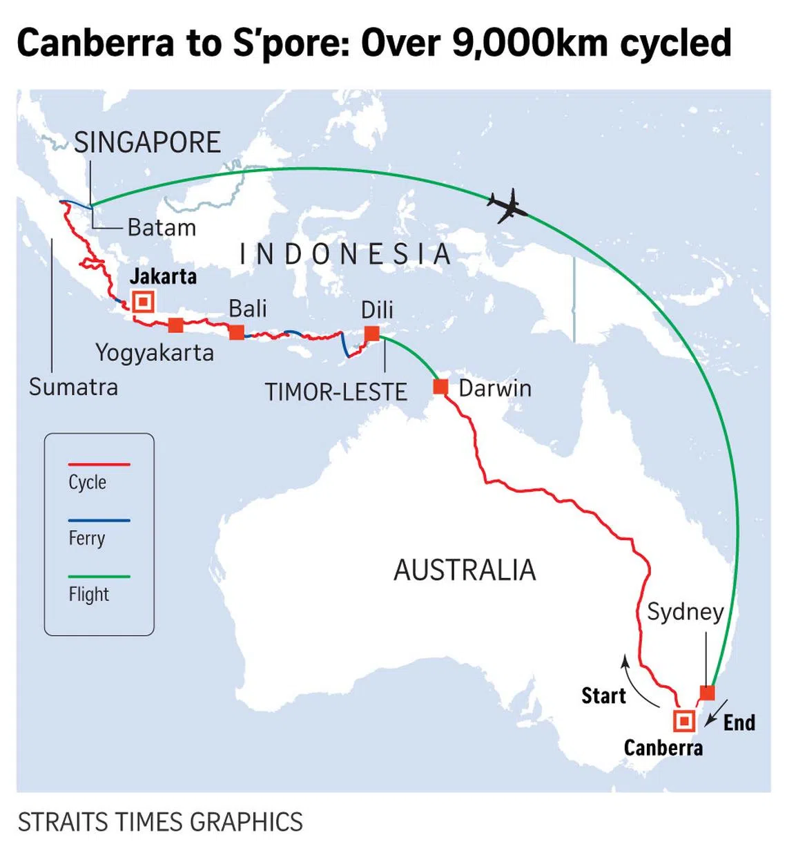 He will then cycle for another 300km to Canberra over three days. By the time he reaches home, he would have clocked over 10,000km on his bike.