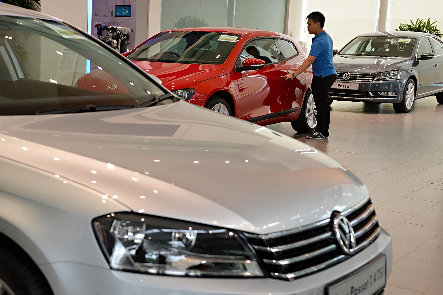 A visitor looking at a car at the Volkswagen Centre showroom.