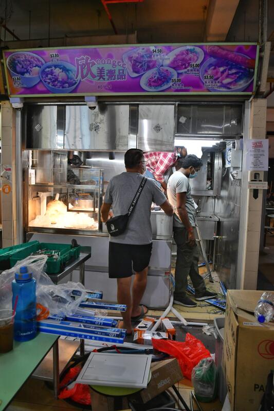 The affected stall, which sells congee, was observed to be under renovation on Tuesday night. Two workers were spotted inside the stall tinkering with the wiring and installing new equipment.