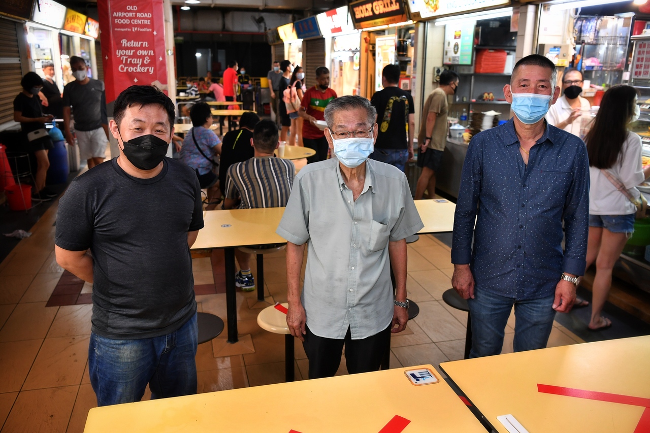 (From left) Mr Zhu Si Jun, Mr Francis Tan and Mr Tan Bak Yong are among the seven hawkers who fought the fire.