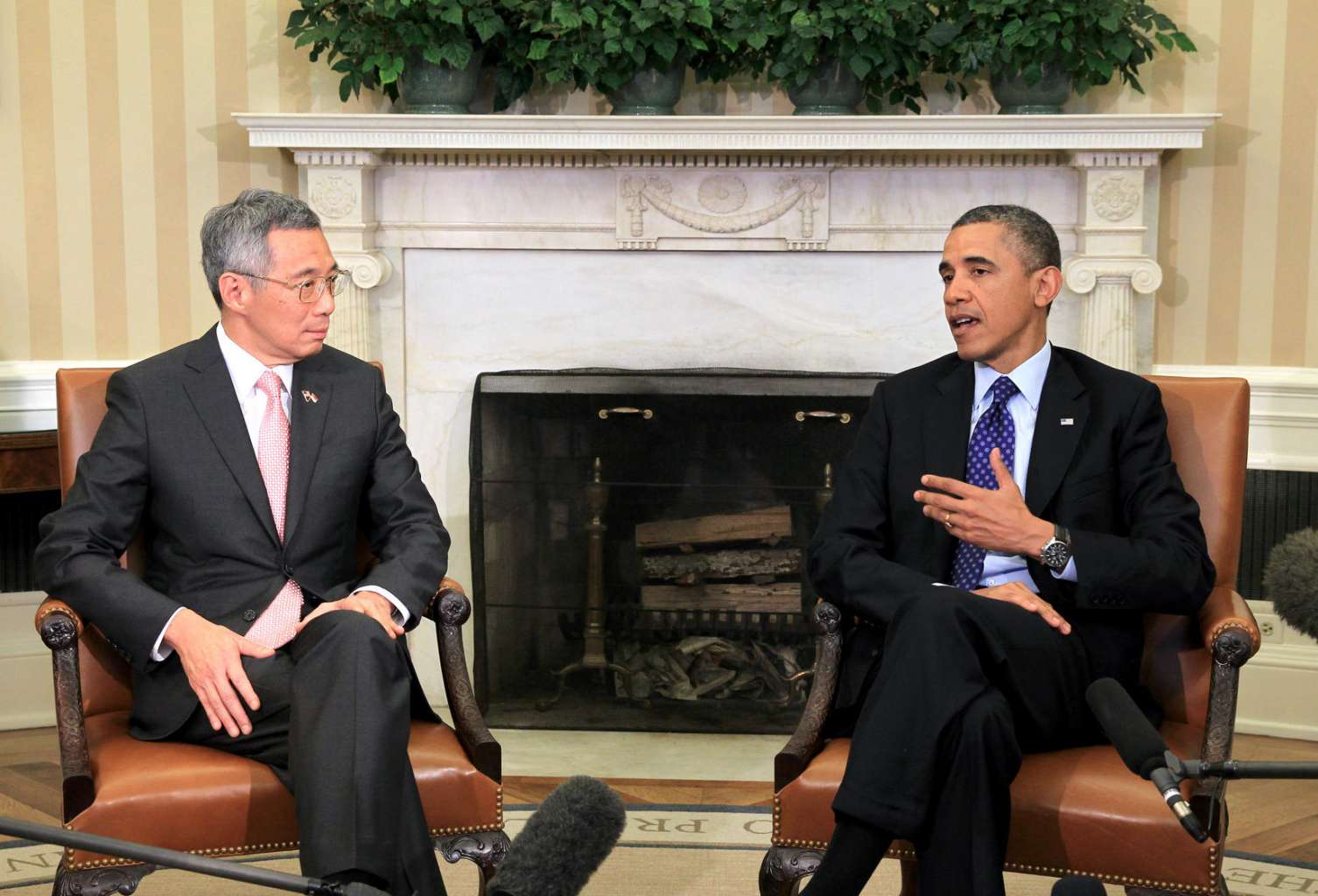 Prime Minister Lee Hsien Loong speaks with US President Barack Obama at a meeting in the White House's Oval Office on April 2, 2013.