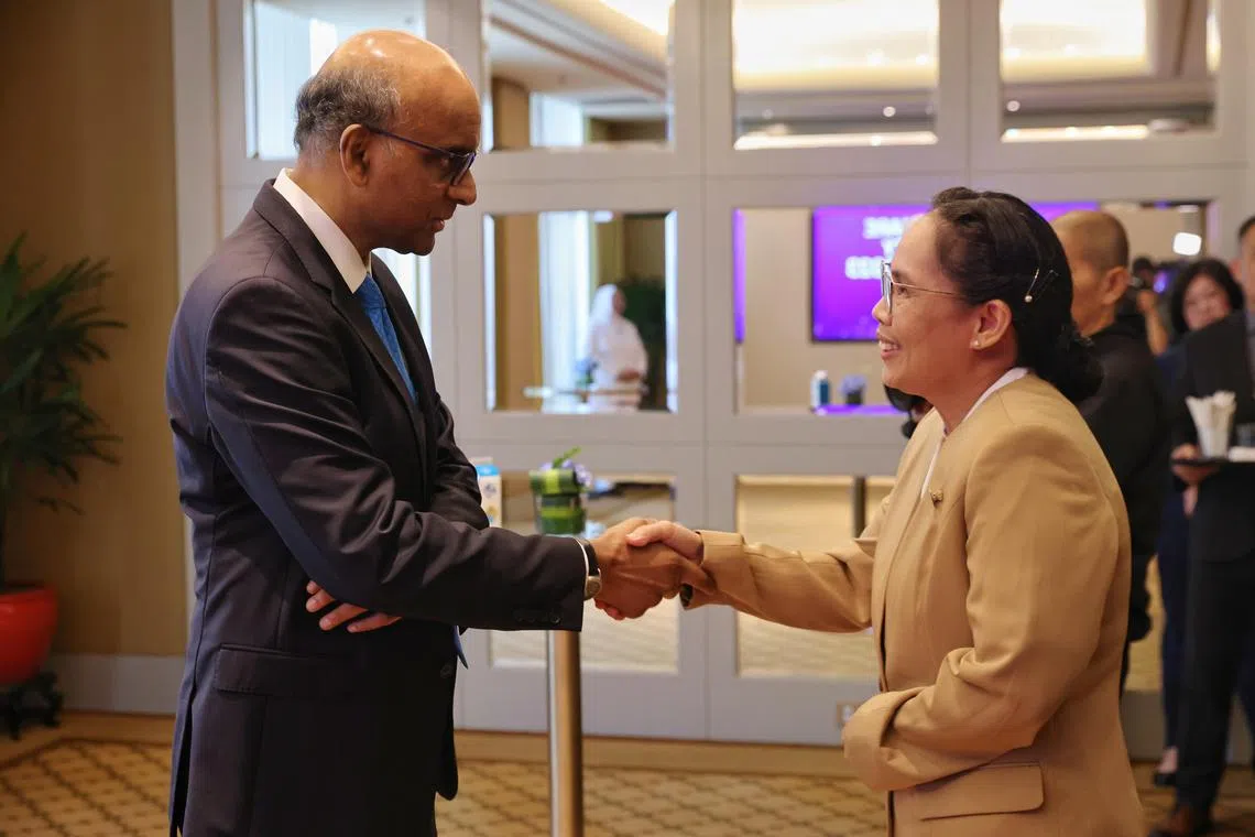 Healthcare Humanity Award winner Evangeline Reyes Balboa, an assistant nurse clinician at Mount Elizabeth Hospital, meeting President Tharman Shanmugaratnam.