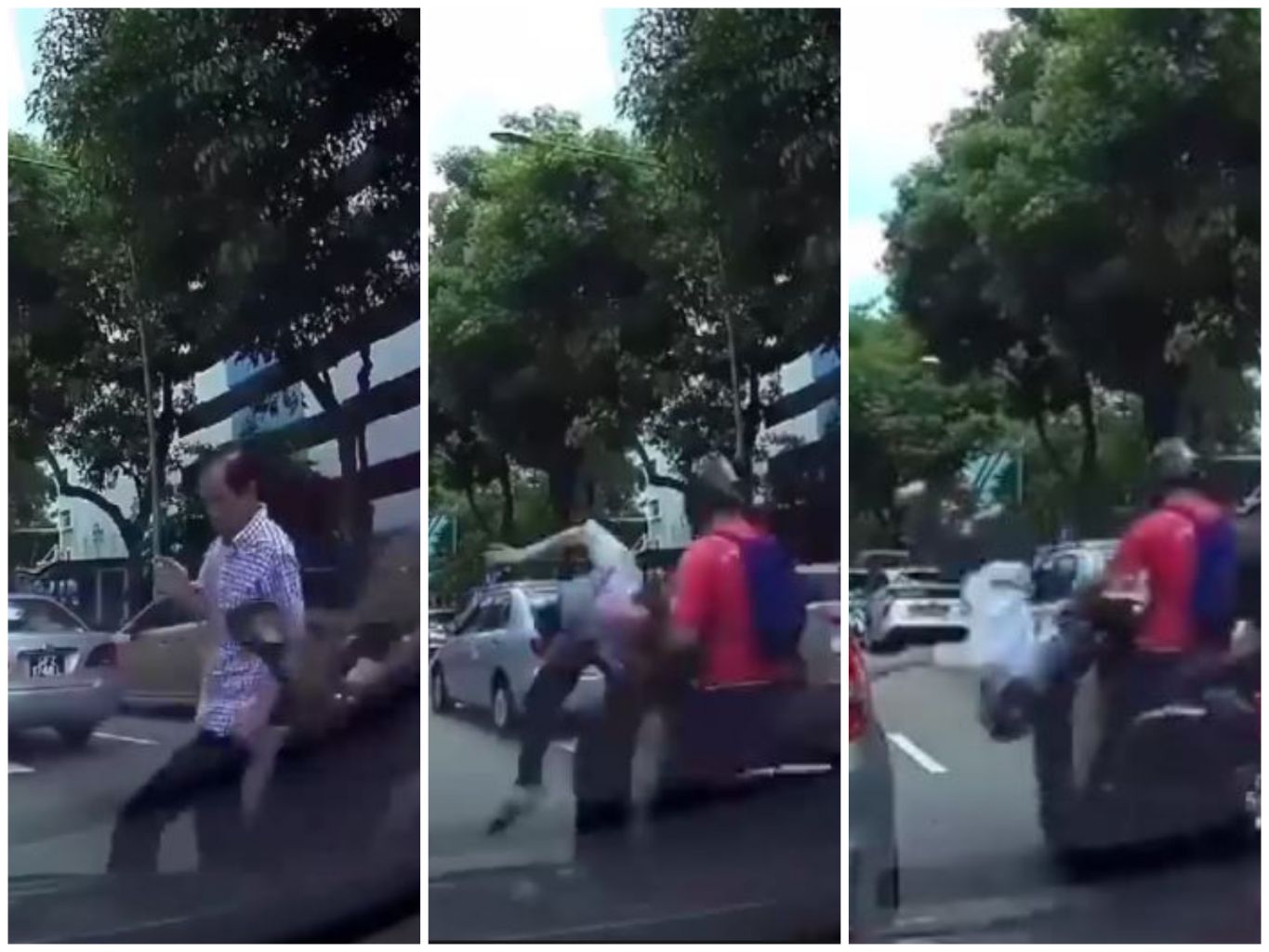 In a video uploaded on road safety page Roads.sg, the pedestrian was sent flying after he was hit by the motorcycle while attempting to jaywalk.