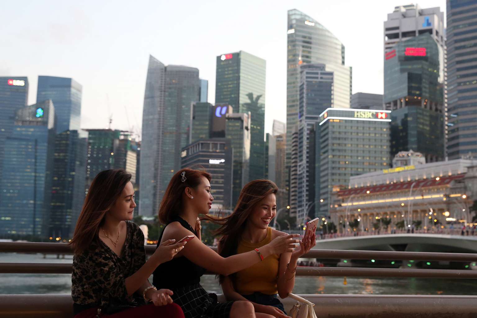 Tourists looking at their mobile phones outside Esplanade in Marina Bay.