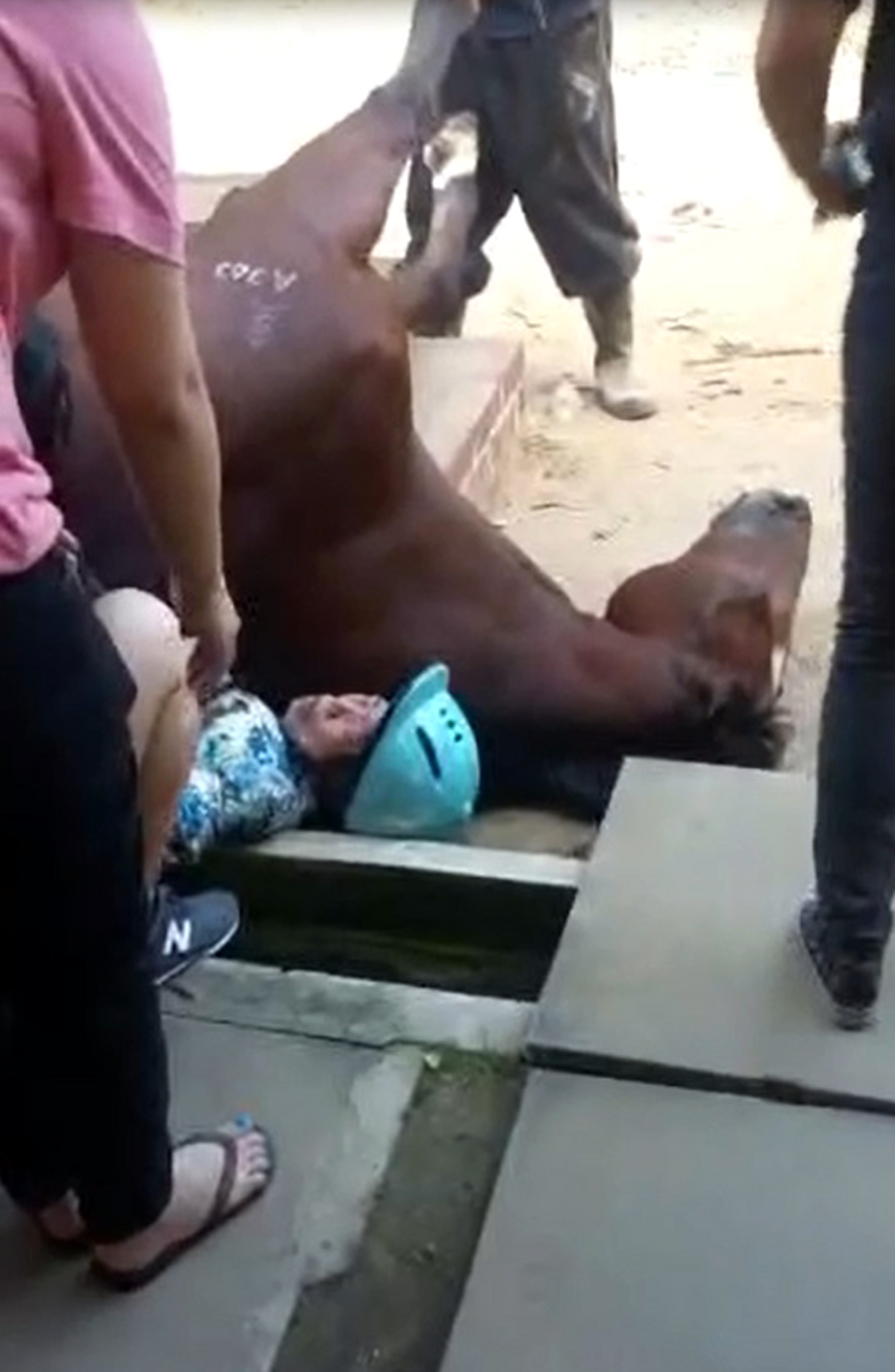 Madam Lim fell off the horse and it fell on top of her, pinning her down.