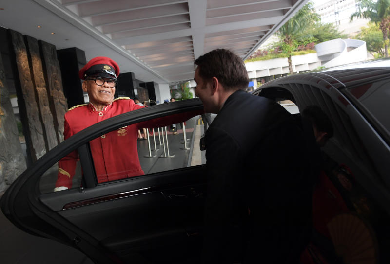 Mr Mohamed Taspir Ahmad, 79, a doorman at the Mandarin Oriental Singapore, opens vehicle doors for guests who arrive at the hotel.