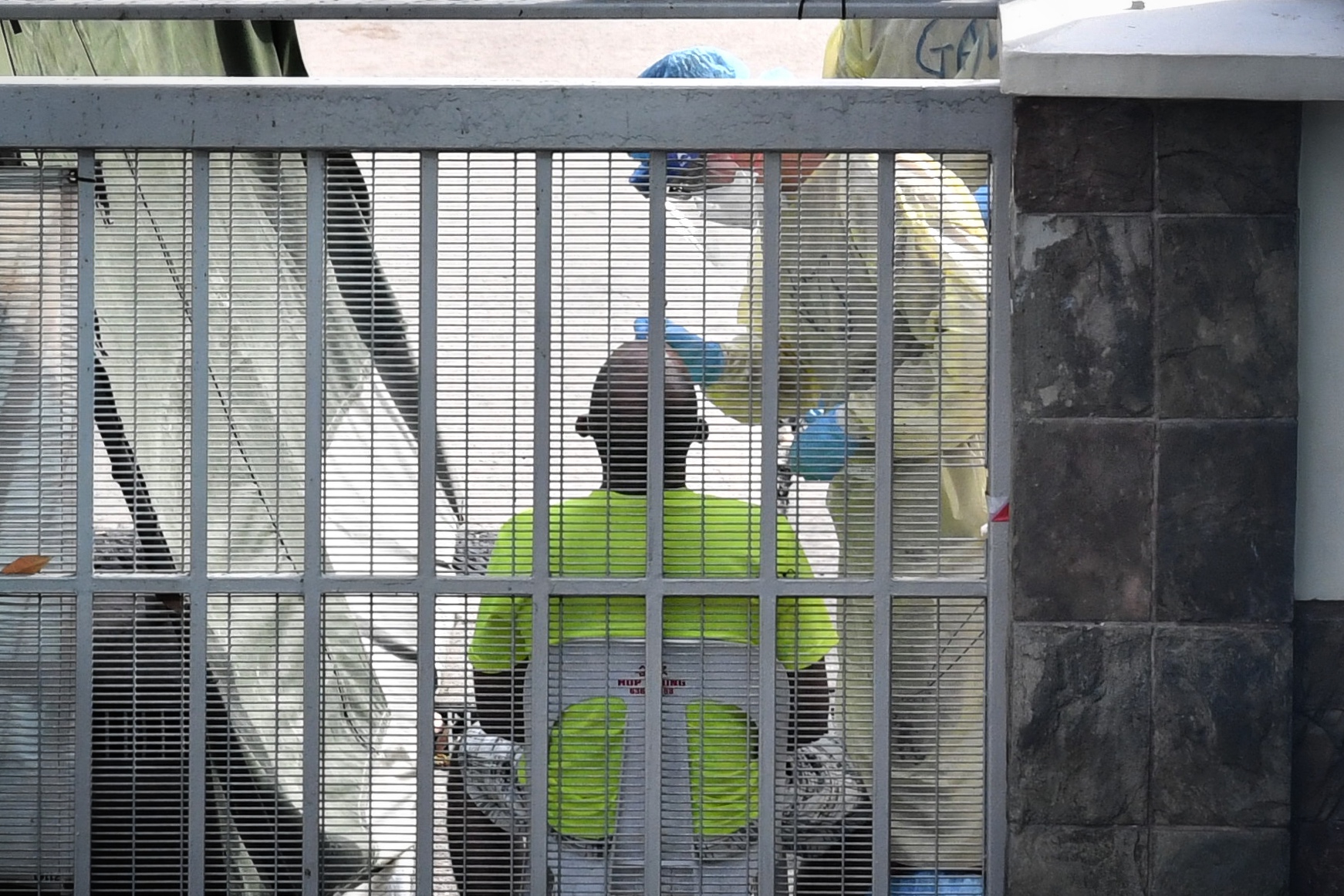 A foreign worker receiving a swab test at Toh Guan Dormitory on May 2, 2020.