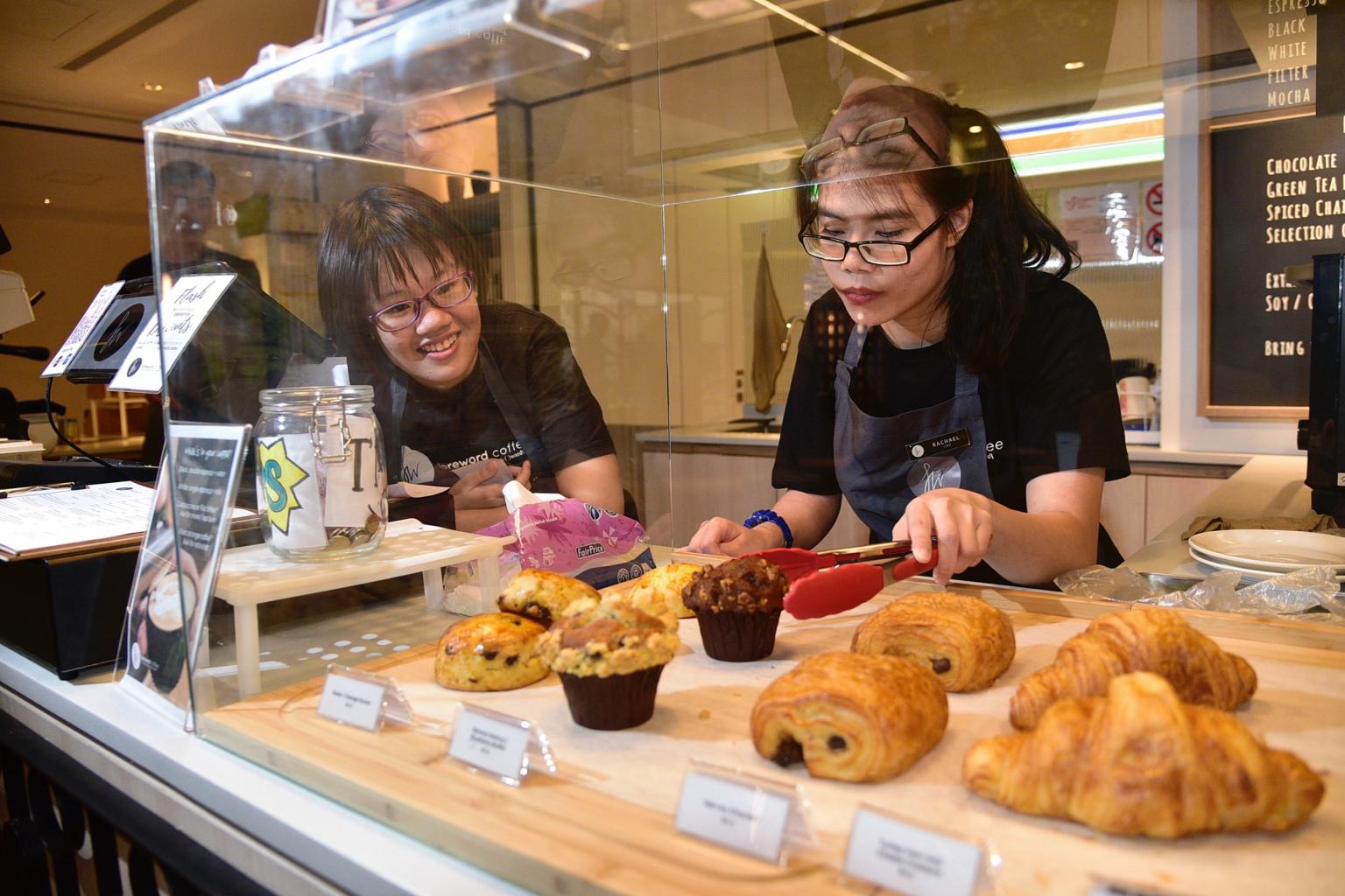 Ms Carmen Tan Yin Xin (left) and Ms Rachel Lum Yuan Ting are employees with special needs who work at Foreword Coffee, one of the Platinum award recipients this year.