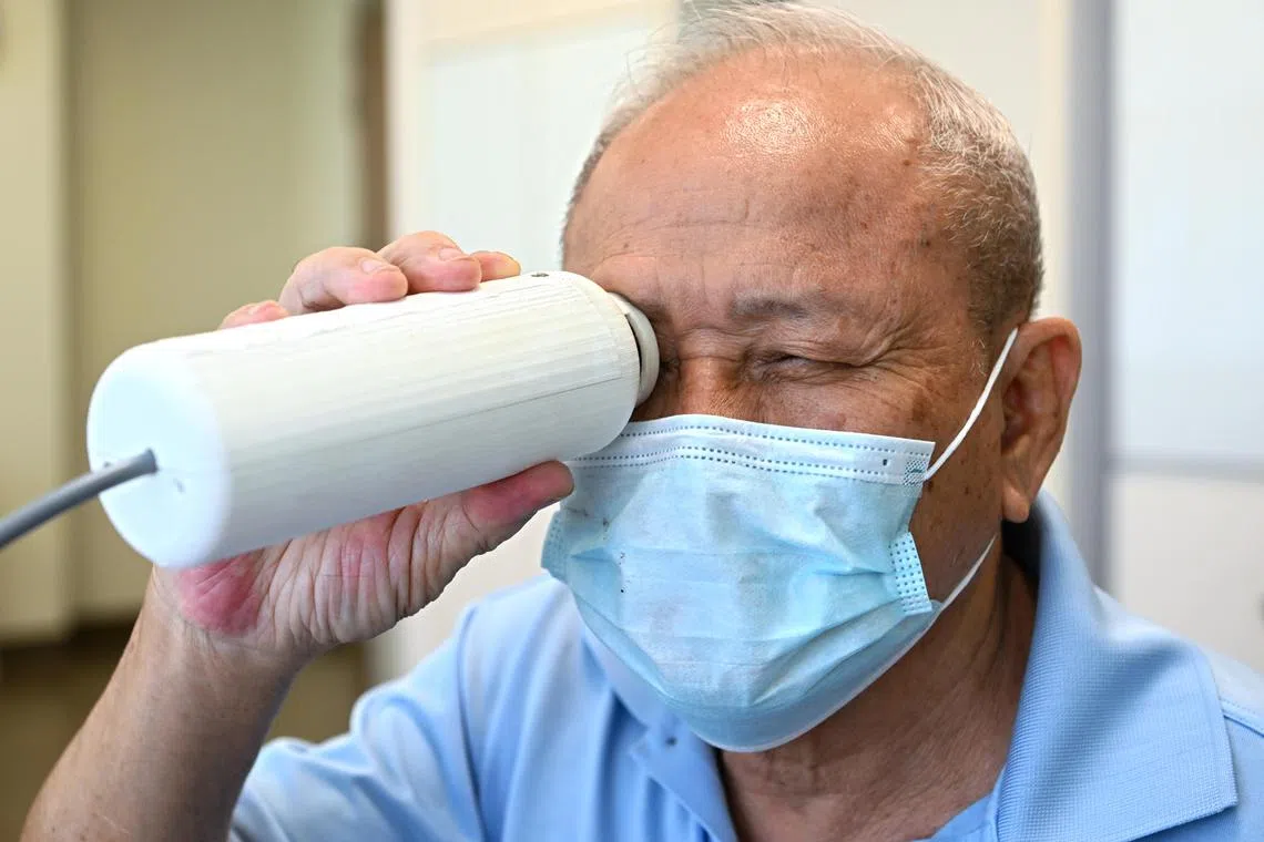 Mr Foong Yee Kong, 76, a part-time cleaner who has cataracts, using the Stop, or self-tonometry device for monitoring of intra-ocular pressure.