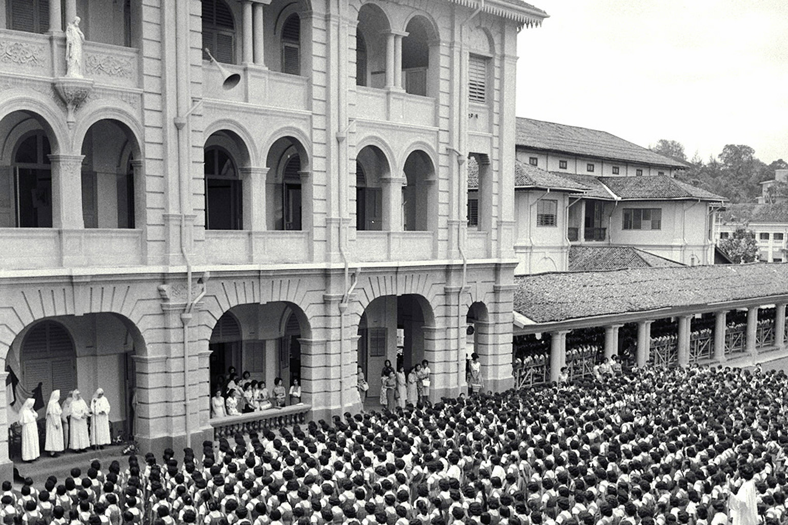 Nearly 4,000 schoolgirls from the Convent of the Holy Infant Jesus and St Nicholas Convent welcoming the world head of their institution, Reverend Mother St John, from Paris on Jan 10, 1961, at their premises in Victoria Street.