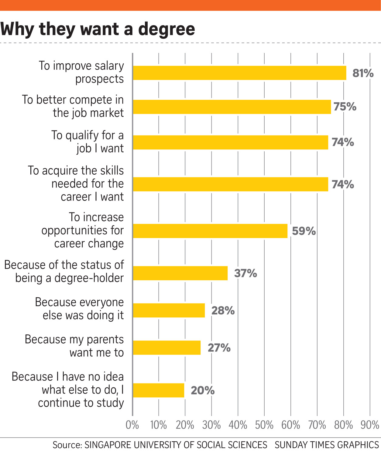 Of the 1,056 19-year-olds surveyed in the ST-SUSS survey, 27 per cent were already pursuing a degree or already had a place in university. Of the others, 91 per cent said they wanted a degree. The reason for their hunger for degrees - to earn higher salaries, to better compete in the job market and access the careers they want. Only 37 per cent said it was for the status of being a degree holder.