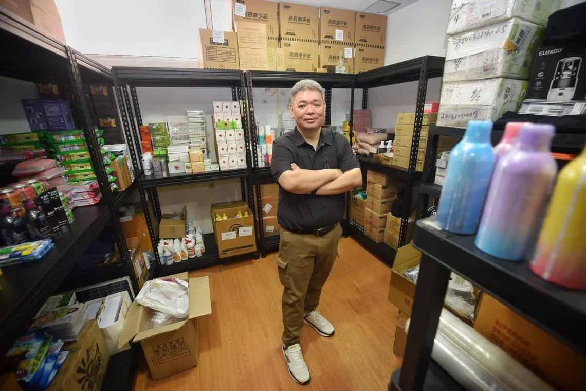 Mr Wisley Yip with all the items he had bought from live streams. He keeps the items in the storeroom of a cafe he owns at Textile Centre.