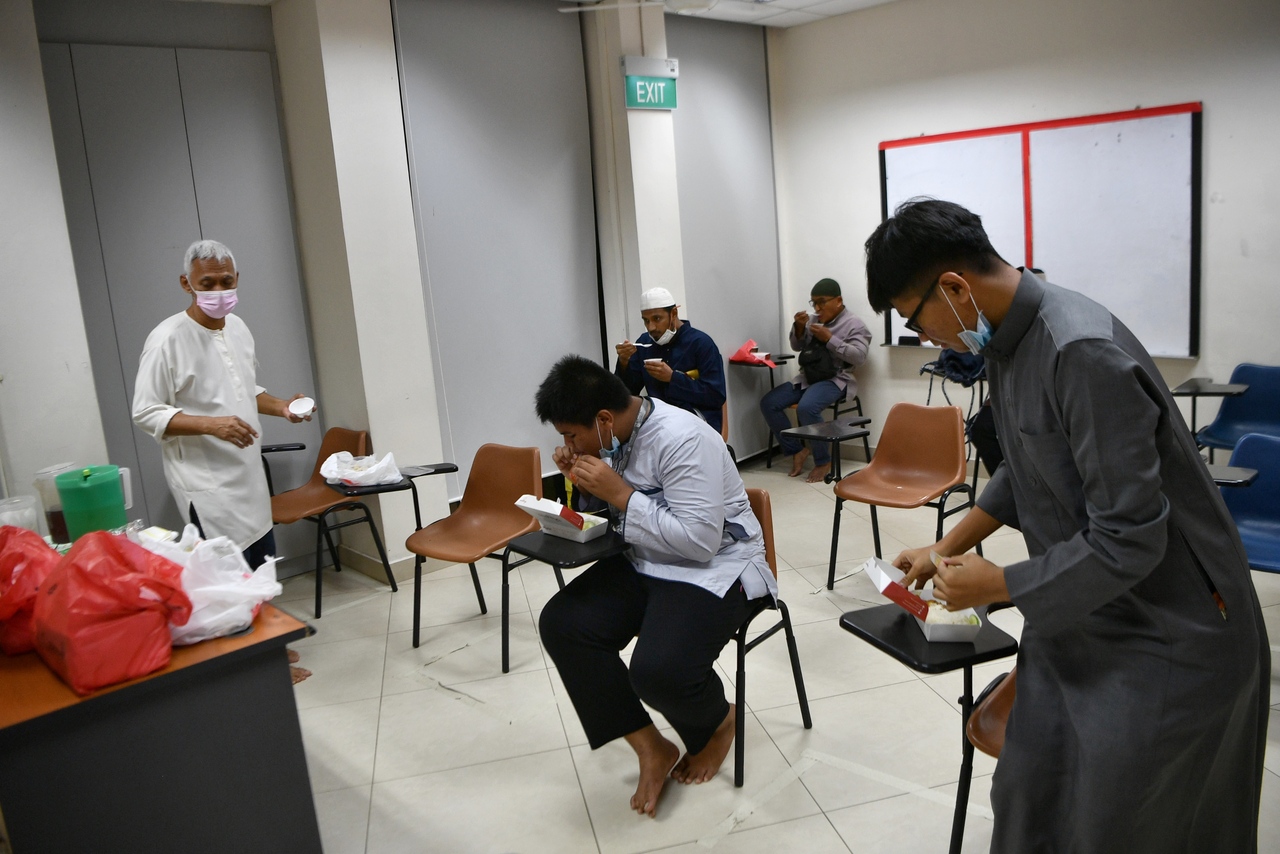 Staff and volunteers of Al-Muttaqin Mosque having chicken rice and other snacks to break their fasts proper.