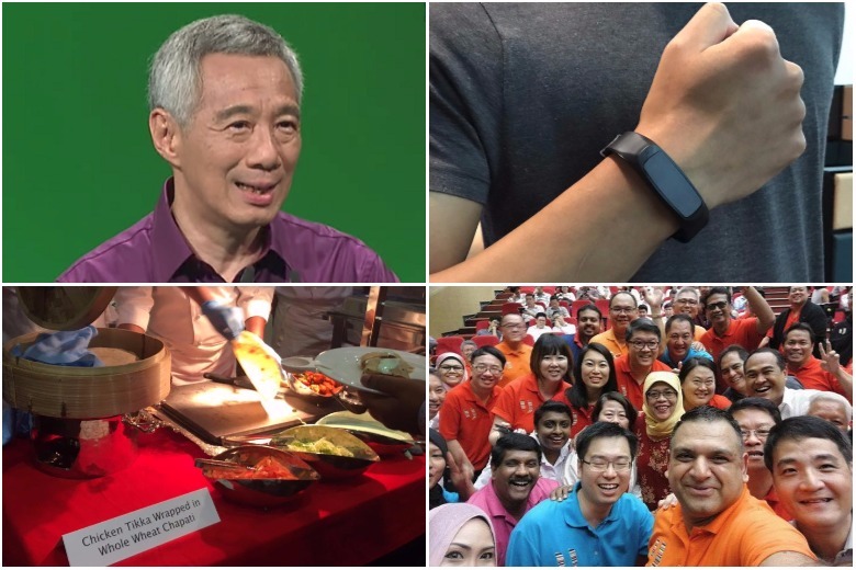 Clockwise from top left: PM Lee Hsien Loong in a purple shirt for NDR 2017, the Fitbit fitness tracker that guests received, Madam Halimah Yacob's wefie with her union friends, and food that were served to guests at the rally.