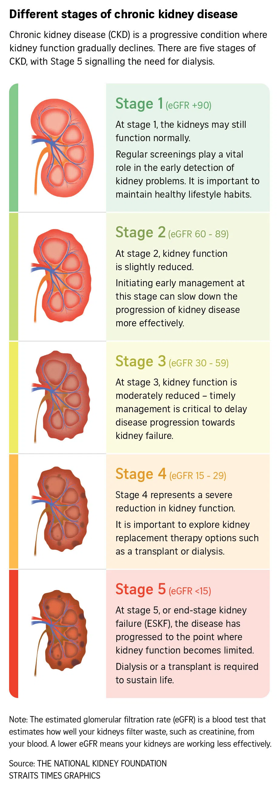 For those with CKD, kidney function deteriorates by 10 per cent a year (in healthy people, it’s 0.5 per cent to 1 per cent a year from the age of 30 to 40).