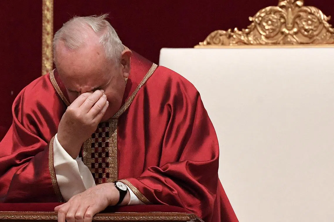 Pope Francis praying during the Celebration of the Lord’s Passion on Good Friday at St Peter’s Basilica, on April 19, 2019, in the Vatican.