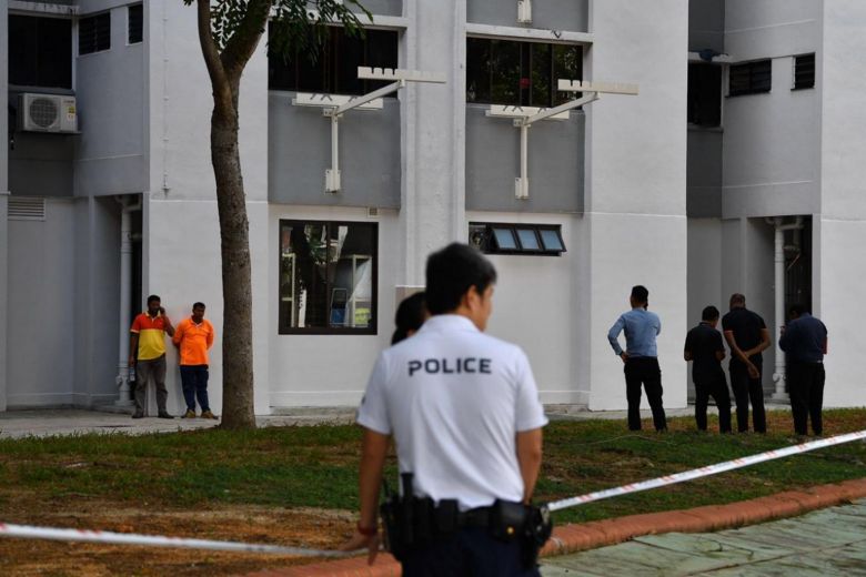 Cleaners and police officers at Block 534 Bedok North Street 3, on Jan 7, 2020, where a baby boy was found abandoned in a rubbish chute.
