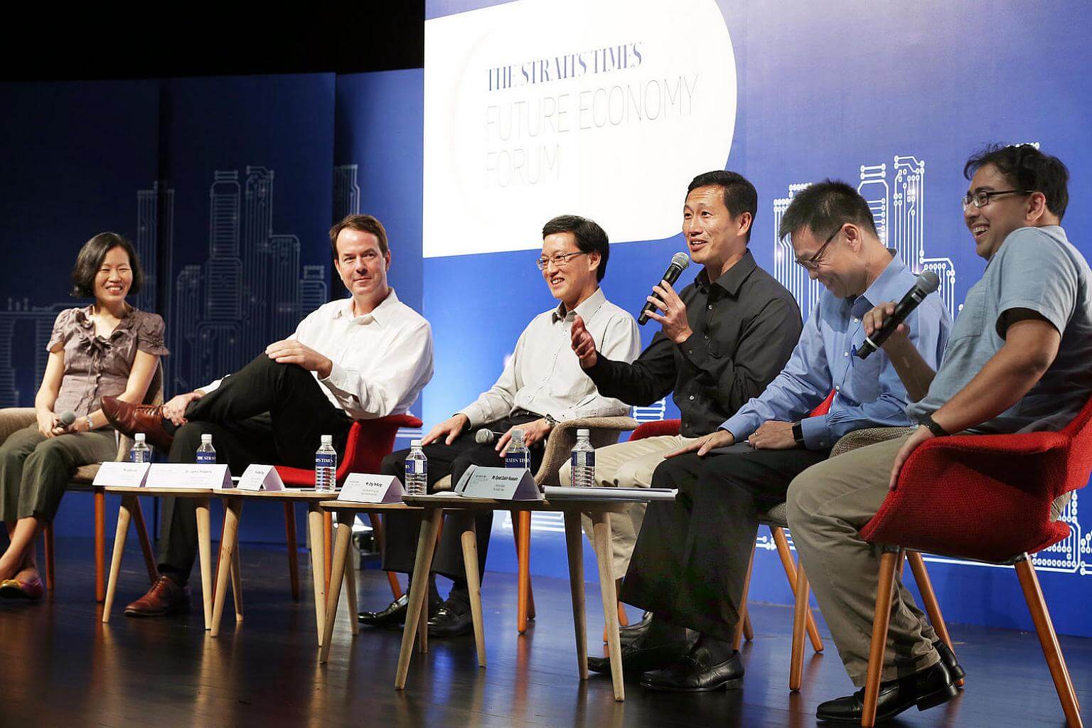 (From left) Ms Lydia Lim, Dr John Powers, Mr Andrew Chong, Minister Ong Ye Kung, Mr Yeoh Keat Chuan and Mr Syed Zakir Hussain at The Straits Times Future Economy Forum.