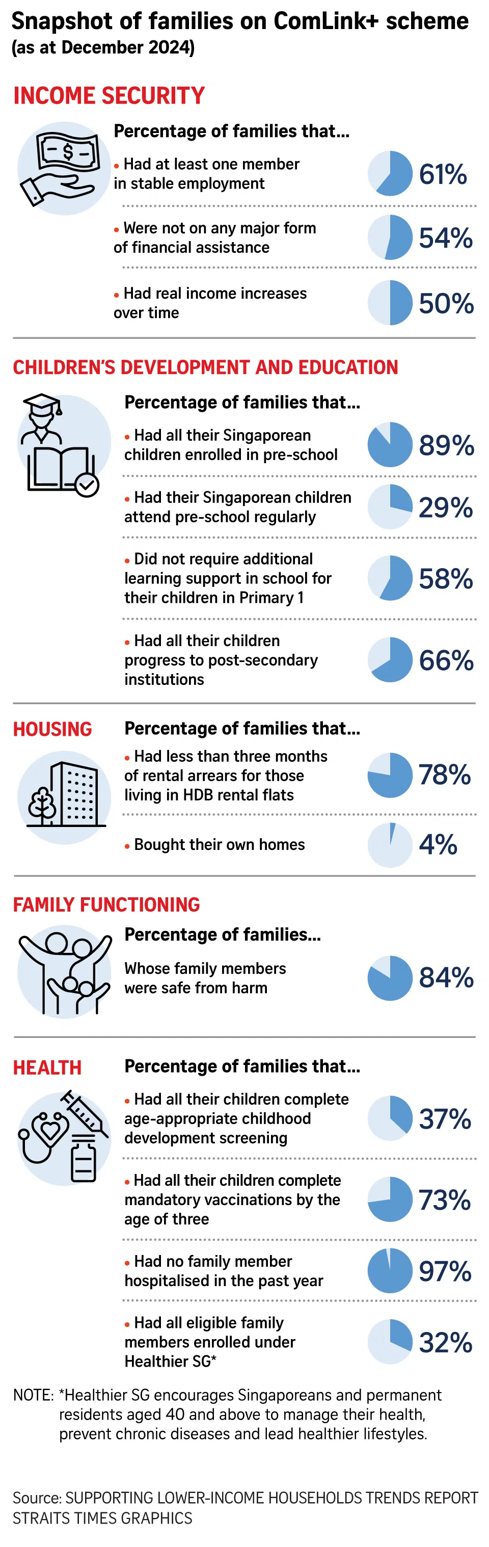 For families with older school-going children, 69 per cent of them in 2024 were deemed self-reliant. This is when all their school-going children are enrolled in school, attend school regularly and have progressed to post-secondary institutions.