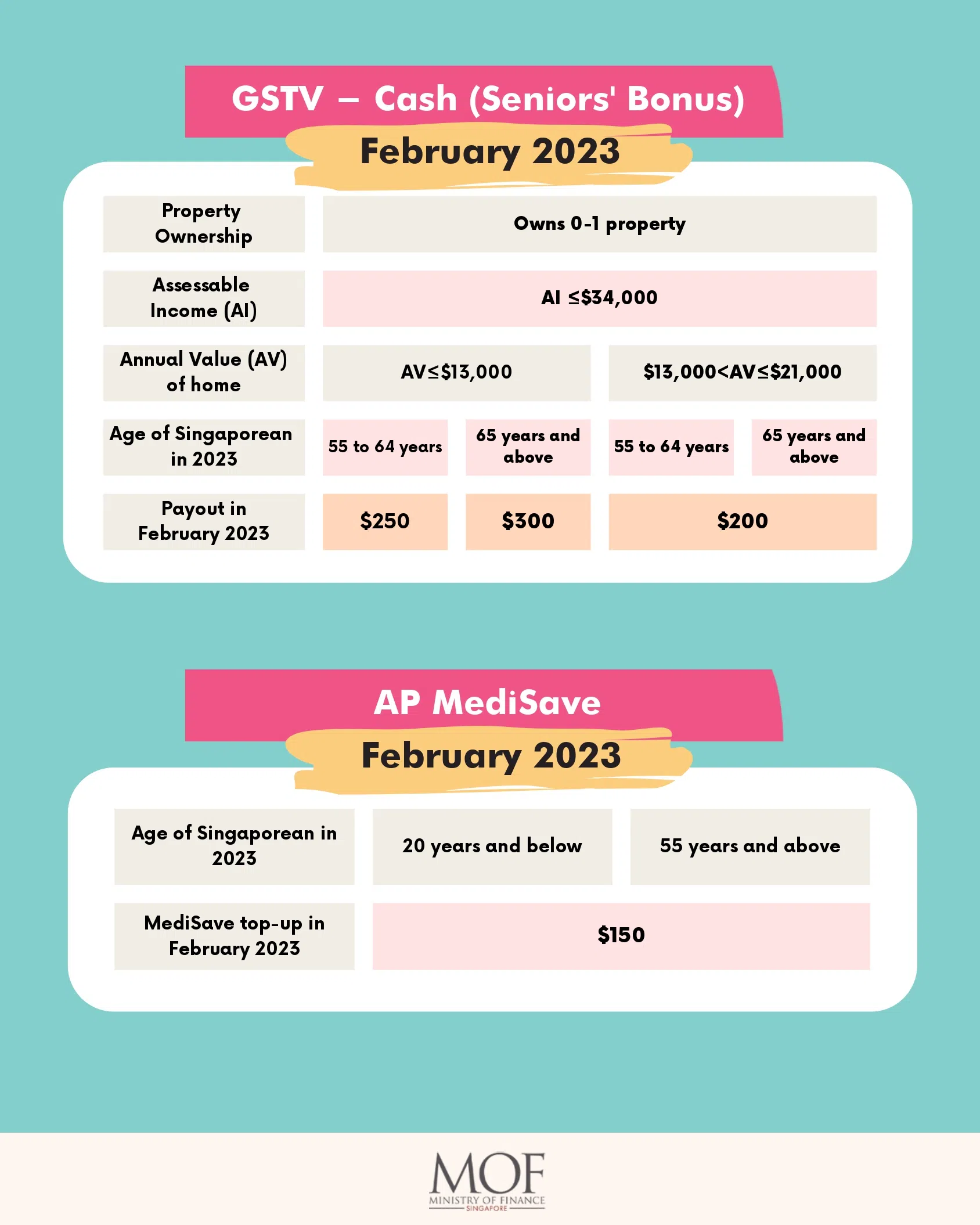 In February 2023, lower-income senior Singaporeans will get up to $300 in cash under the GSTV – Cash (Seniors’ Bonus). And eligible seniors aged 55 and above, and children aged 20 and below, will get $150 in their Central Provident Fund MediSave Account under the Assurance Package MediSave.
