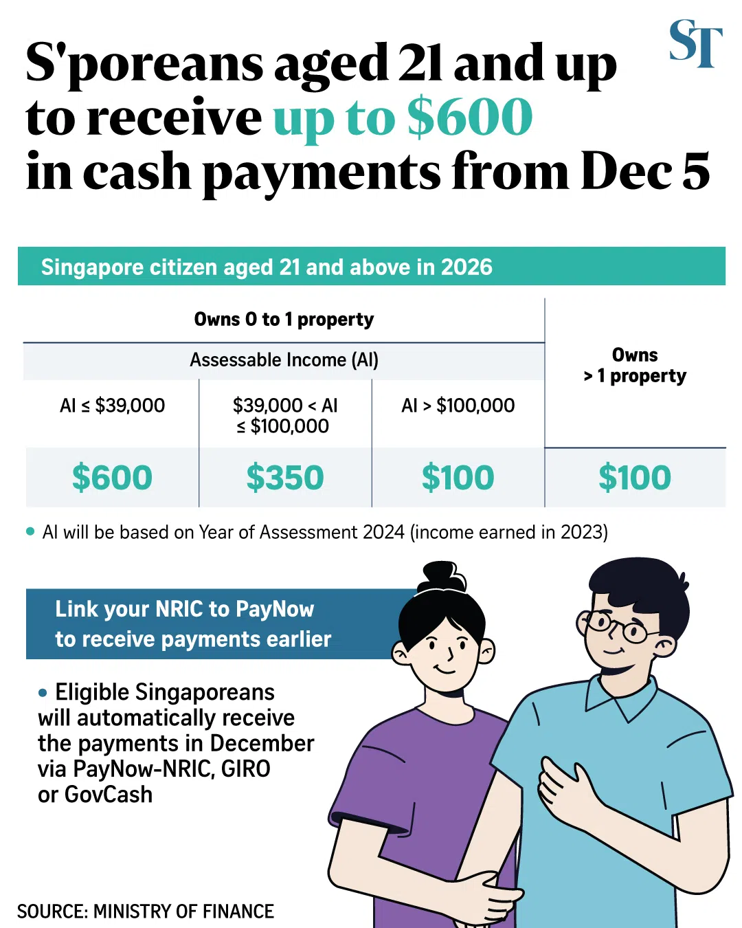 SINGAPORE - Some three million adult Singaporeans aged 21 and above in 2026 will receive a cash payment of between $100 and $600 from Dec 5.