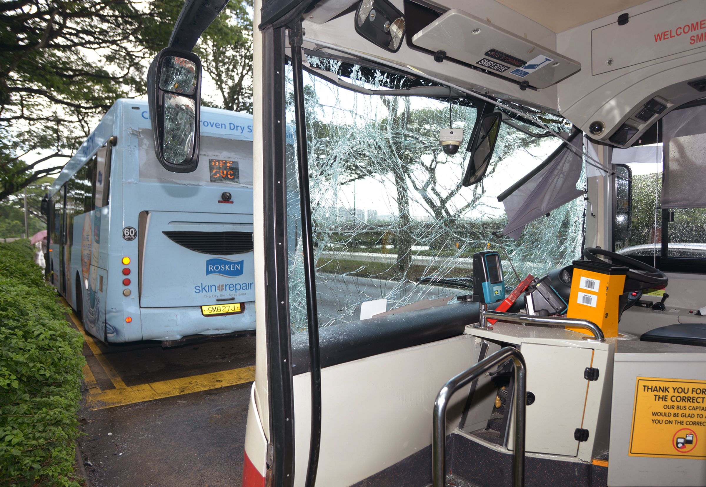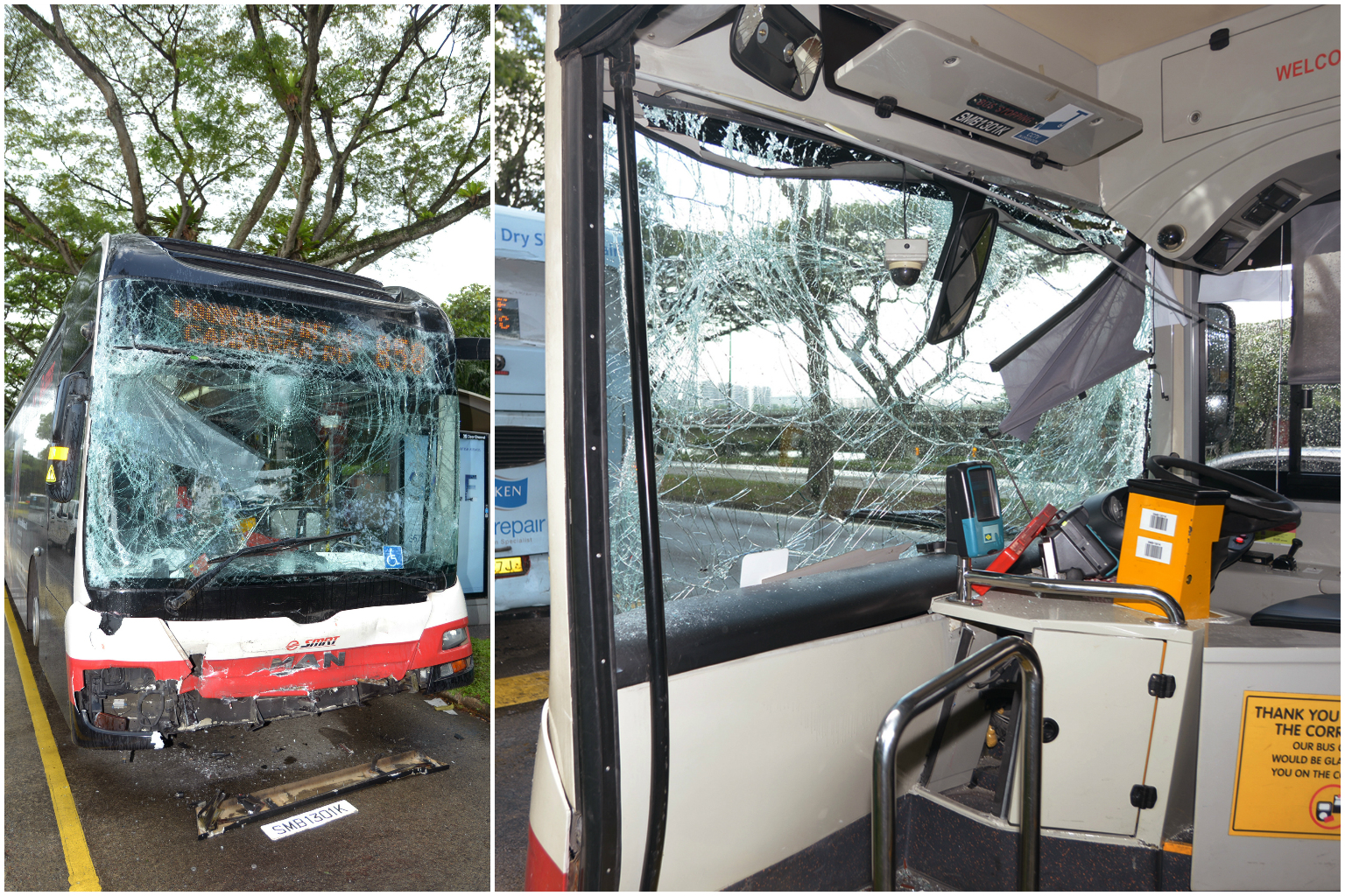The shattered front of SMRT bus service 858 (left) and its damaged interior.