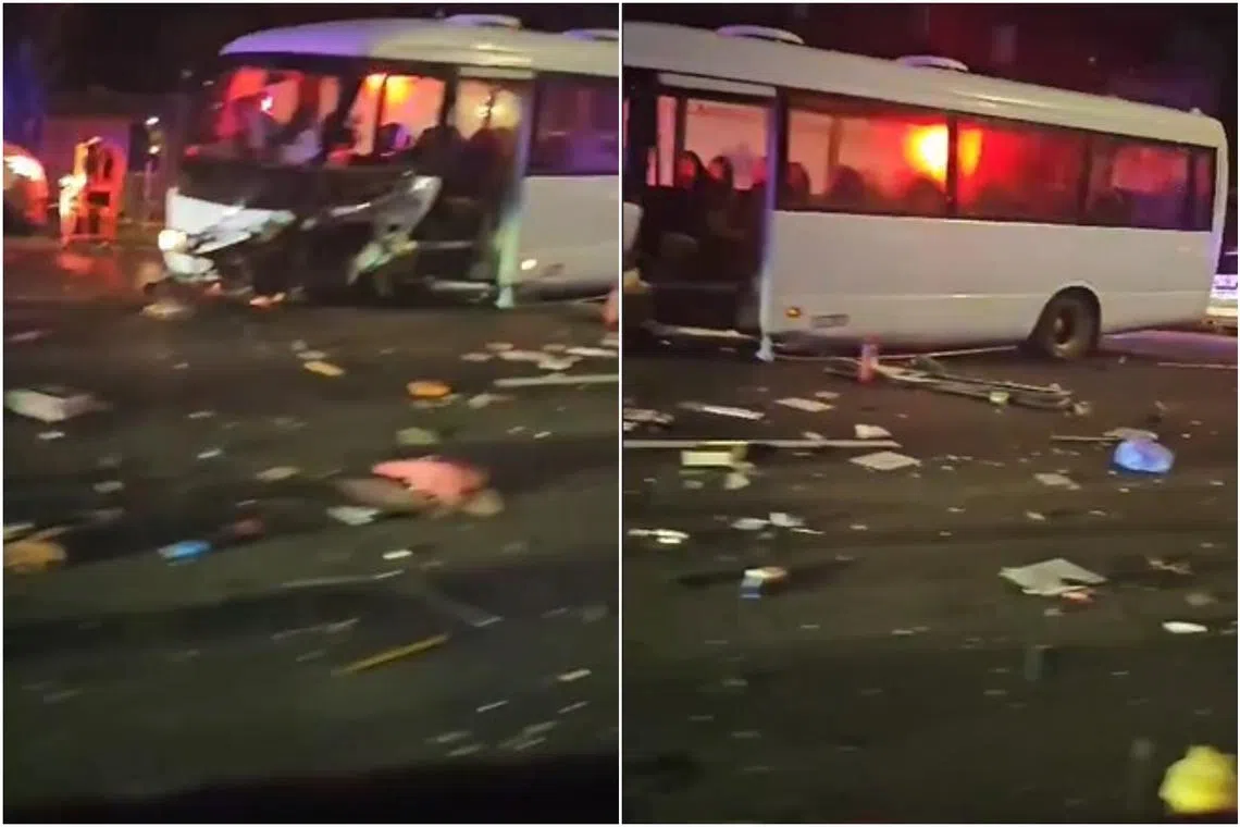 Several videos of the accident’s aftermath shared in a Telegram group show a badly damaged bus with its two front wheels dislodged. In one video, a burning car is seen near the crash site.
