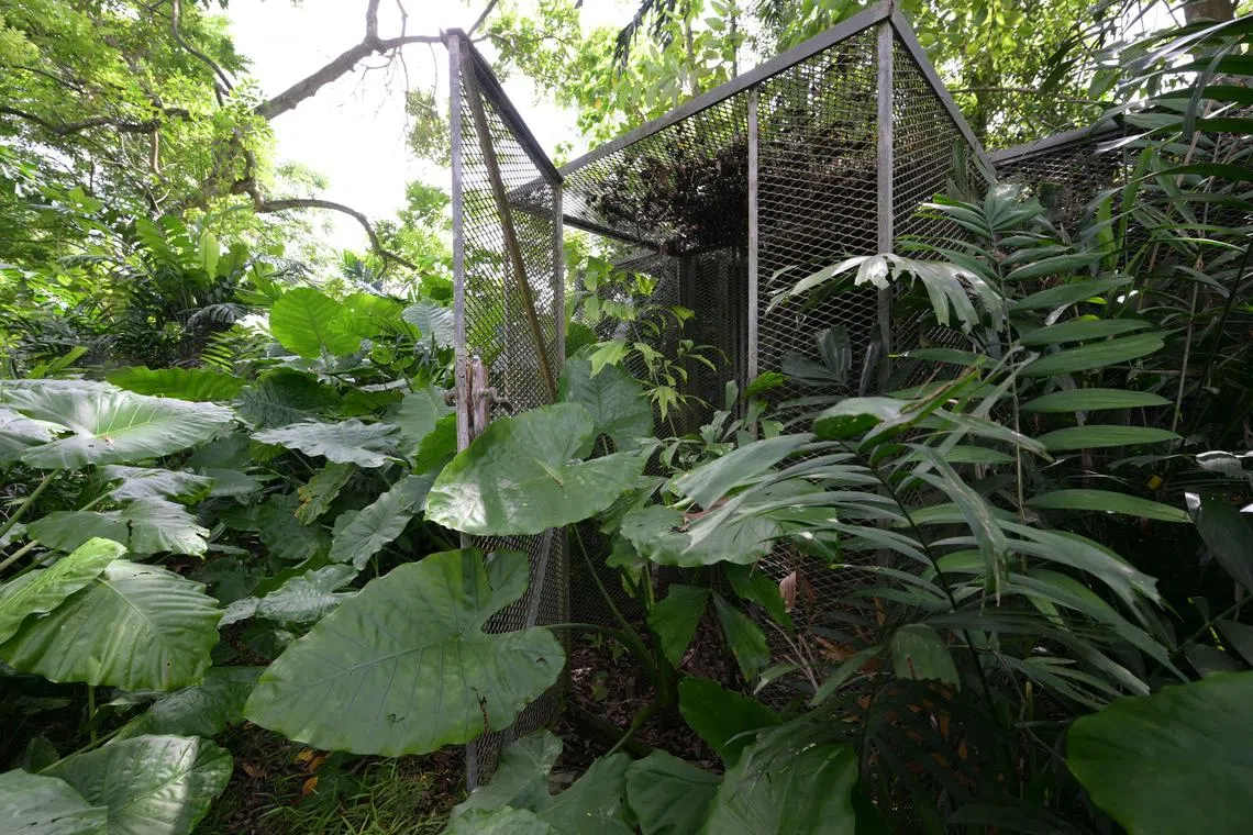 Big enough for humans to walk into, the enclosures are still standing but have been shrouded with creepers, while a tree has broken through a roof.