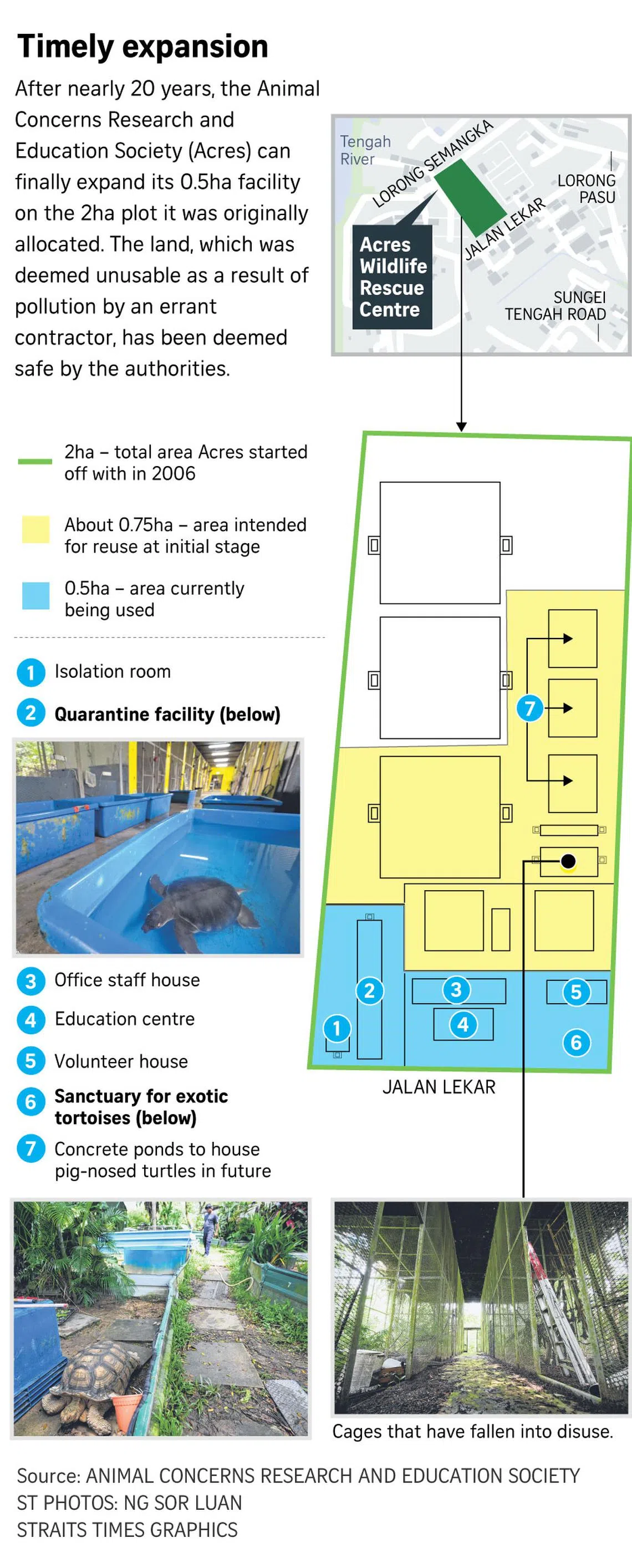 SINGAPORE – For 15 years, the Animal Concerns Research and Education Society (Acres) Wildlife Rescue Centre has been occupying only a quarter of the 2ha land assigned to it.
