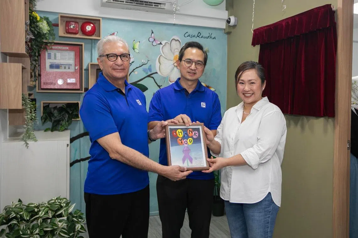 Singapore Pools chairman Kai Nargolwala (far left) and chief executive officer Lam Chee Weng (middle) at the official opening of Casa Raudha’s new one-stop centre, a space provided by Singapore Pools for charities to use rent-free under its Community Housing Scheme. PHOTO: SINGAPORE POOLS