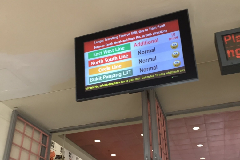 Information screens informed commuters that there was "longer travelling time on EWL due to train fault". This was between Tanah Merah and Pasir Ris stations, in both directions.