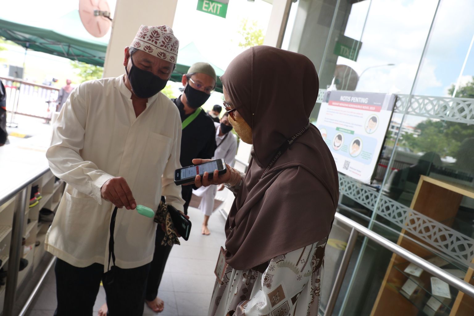 Congregants checking in using the TraceTogether token at Masjid Maarof at Jurong West St 26.