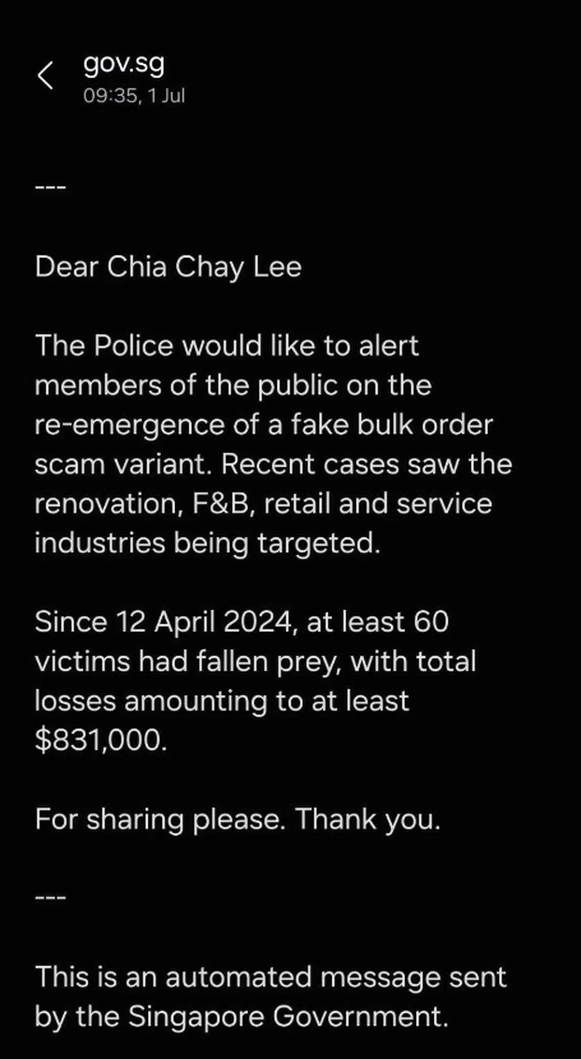 On July 1, an SMS from the police under the “gov.sg” banner was sent out with a warning about the re-emergence of a fake bulk order scam,