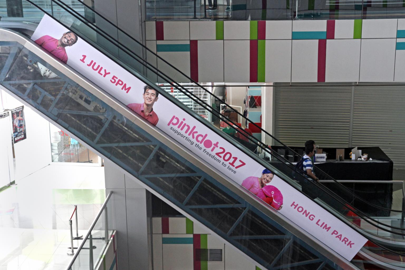 The ads for Pink Dot - an annual lesbian, gay, bisexual and transgender rally - are displayed on the front door panels and along an escalator inside the mall, and had drawn complaints from a Facebook group which is opposed to the event.