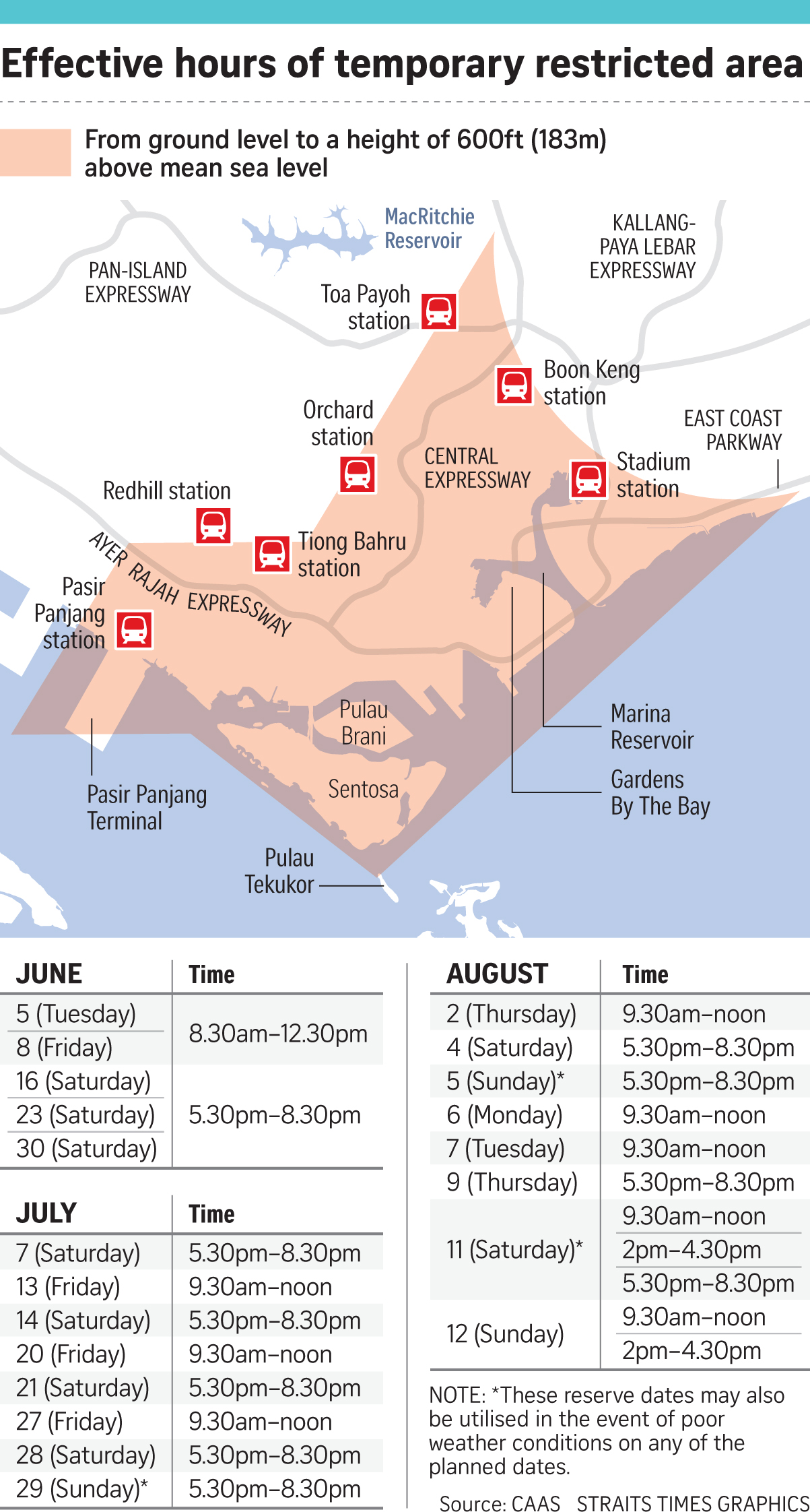 This is to ensure the safety of aircraft flying at low levels as part of aerial activities for the National Day Parade and Republic of Singapore Air Force 50 celebrations.