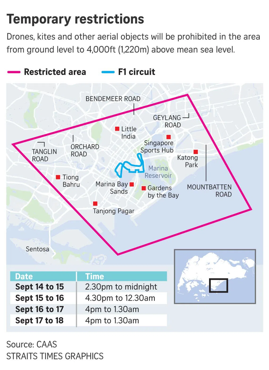 Temporary restricted areas include Marina Bay, the Central Business District, Little India and Tiong Bahru, and extend from ground level to 4,000ft (1,220m) above mean sea level.
