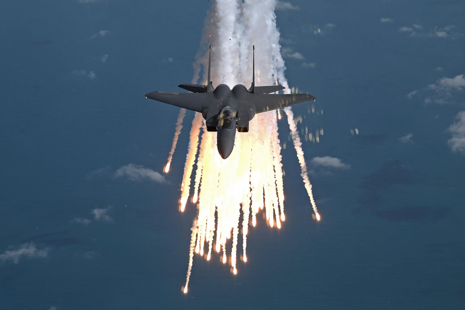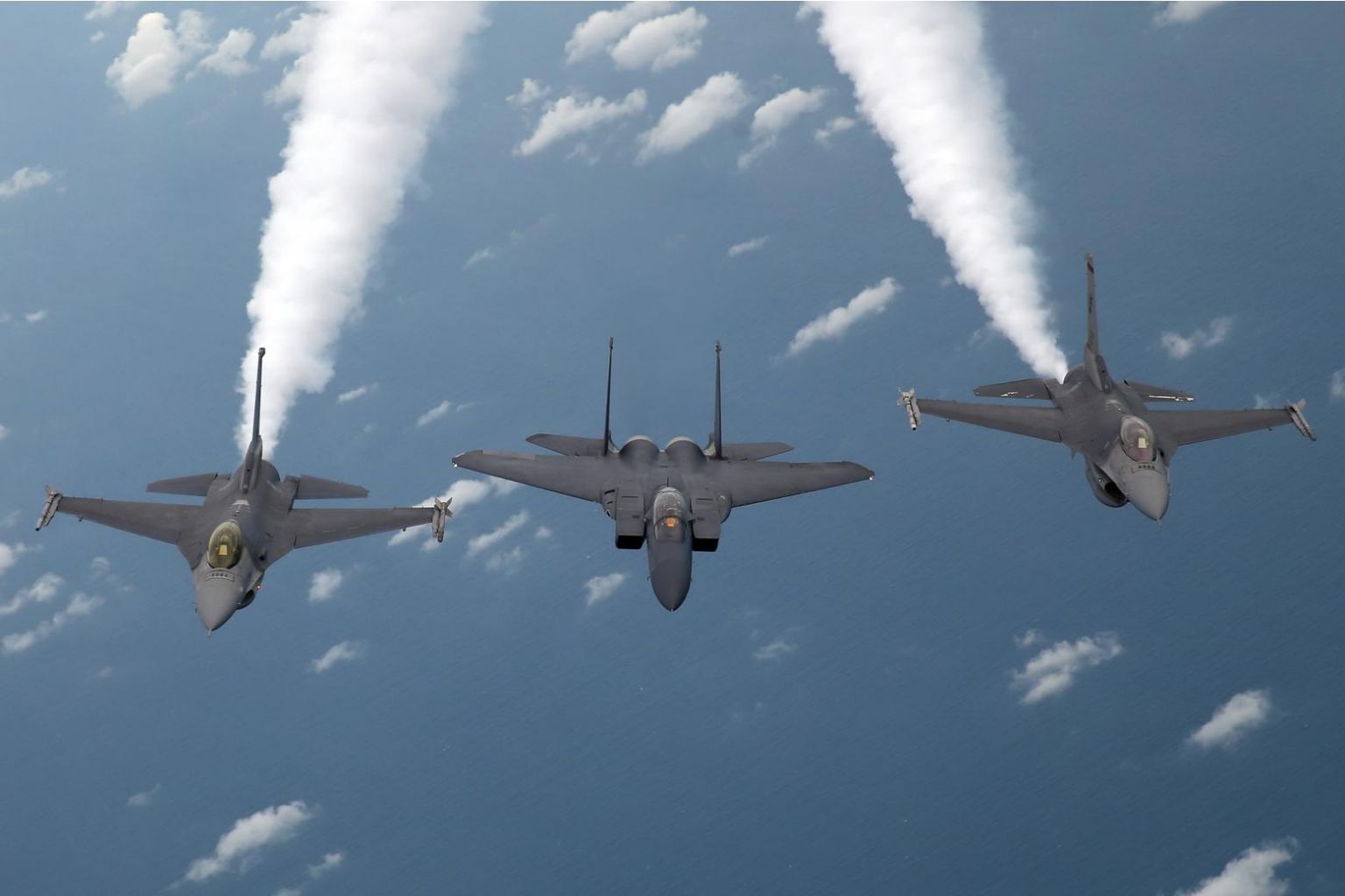 An F-15SG (centre) and two F-16s in formation in a training area north-east of Singapore, during a media preview to highlight the RSAF’s 50th anniversary celebrations.
