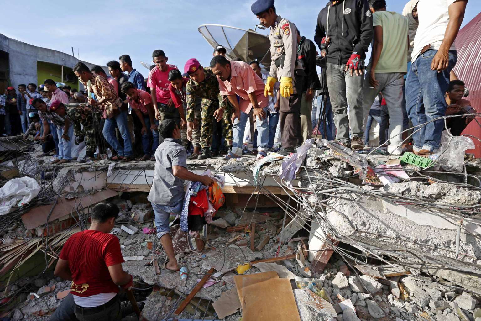 Members of an Indonesian rescue team and local residents searching for victims using an excavator after an earthquake struck Pidie Jaya district, Aceh, Indonesia on Dec 8, 2016.