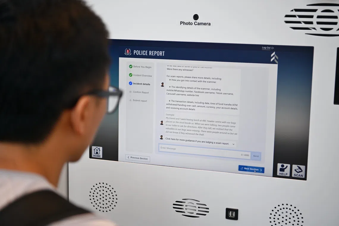 Members of the public can login with Singpass at the kiosks, and have the option to use R-Cop to file a report or do so digitally without using the chatbot.