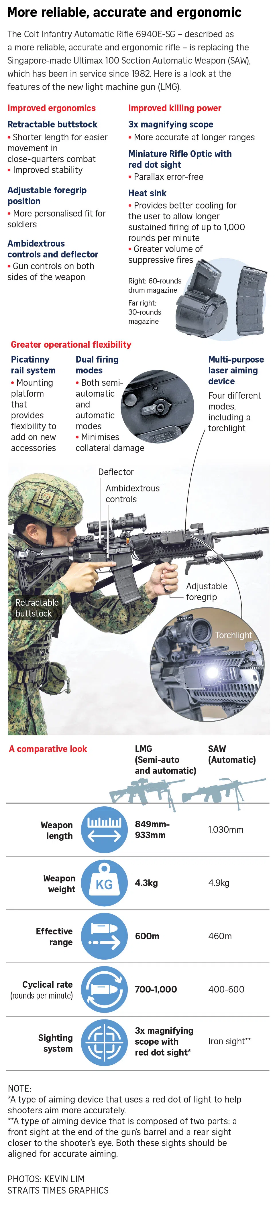The Colt Infantry Automatic Rifle (IAR) 6940E-SG – described as a more reliable, accurate and ergonomic rifle – will replace the Singapore-made Ultimax 100 Section Automatic Weapon (SAW), which has been in service since 1982.