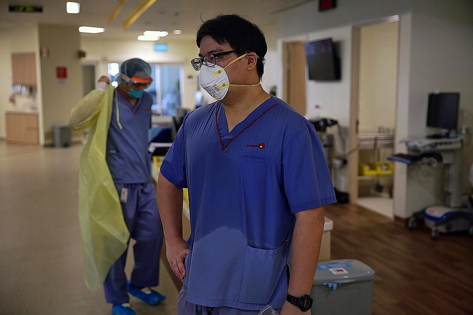 Above: Physiotherapist Alex Poon drenched in sweat from donning full personal protective equipment in Ng Teng Fong General Hospital's isolation ward.