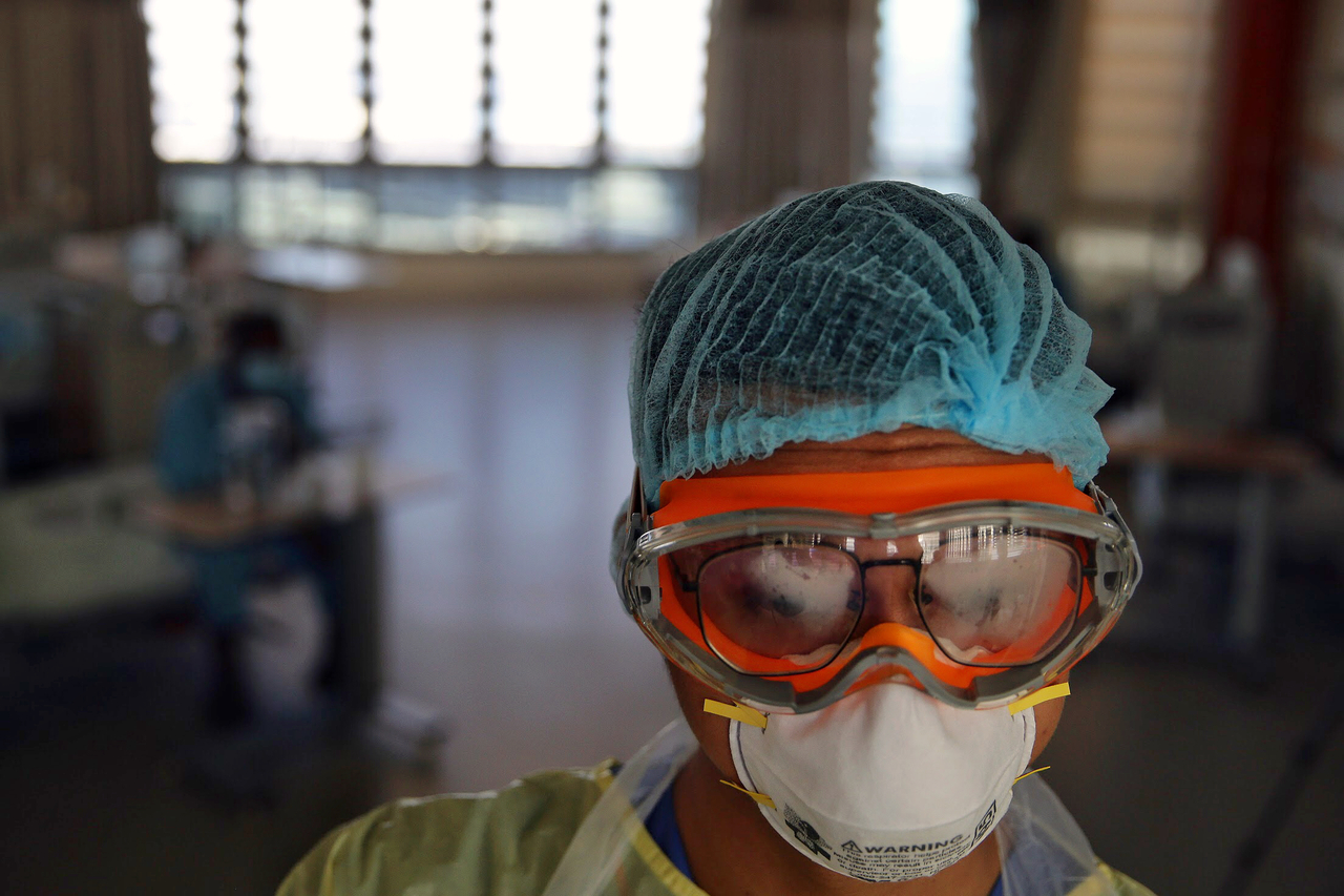 Staff nurse Muhammad Adri Bin Muhammad Jailani, 24, exits with fogged up protective goggles after a shift in the cohort ward of NTFGH housing migrant workers who have been tested positive for Covid-19.
