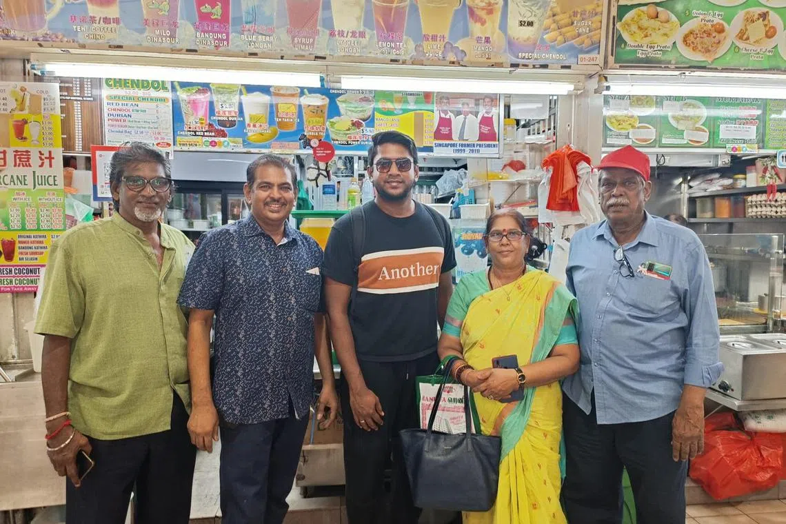Mr Mujibur Rahman (second from left) takes a photo with his customers from Malaysia at his Tekka stall, which is famous for drinks like chendol and mango lassi.