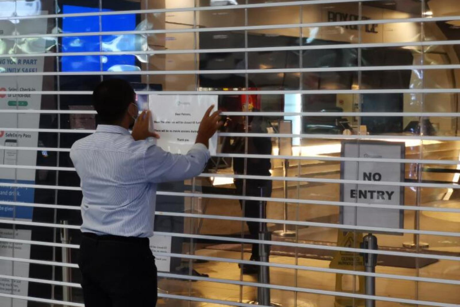 Shaw Theatres staff putting up a closure notice at the Nex outlet on Aug 31, 2020.