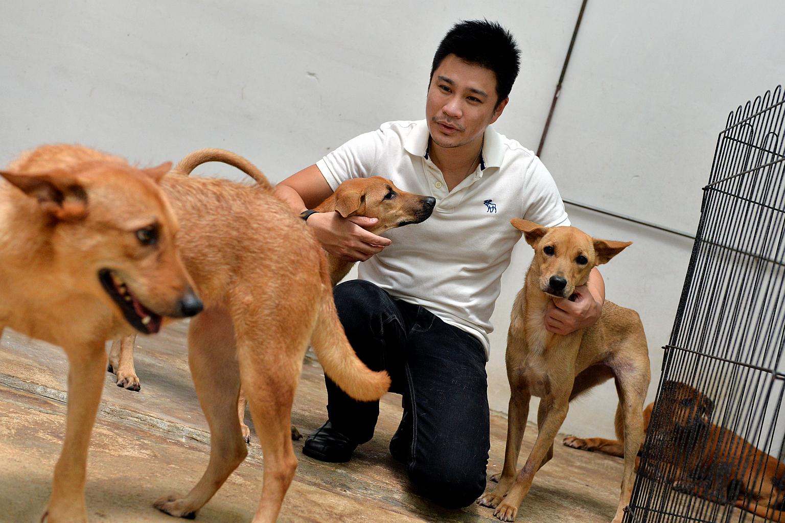Dr Siew Tuck Wah, president of animal welfare group, Save Our Street Dogs (SOSD), with some of the rescued strays at the Pasir Ris shelter.