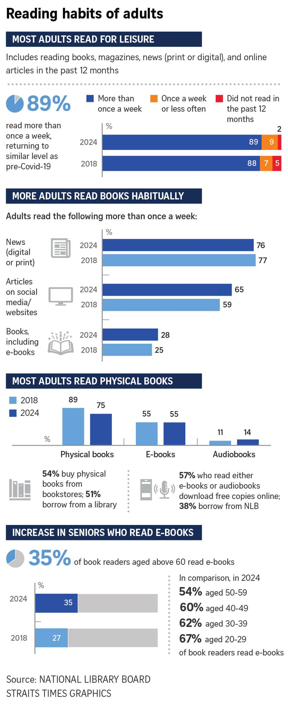 Conducted every three years by the National Library Board (NLB), the 2024 study also found habitual reading levels have reverted to pre-pandemic norms, with 81 per cent of teens and 89 per cent of adults reading multiple times a week.