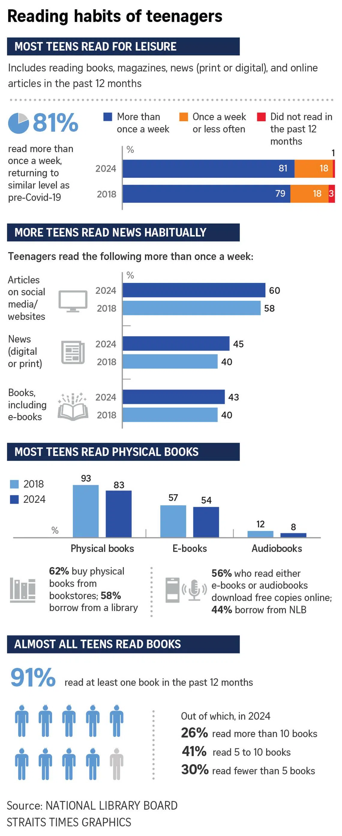 Physical bookstores were the top choice to obtain books, with 62 per cent of teens and 54 per cent of adults purchasing books there. Libraries followed closely, especially among 58 per cent of teens, with 44 per cent borrowing e-books or audiobooks from NLB.
