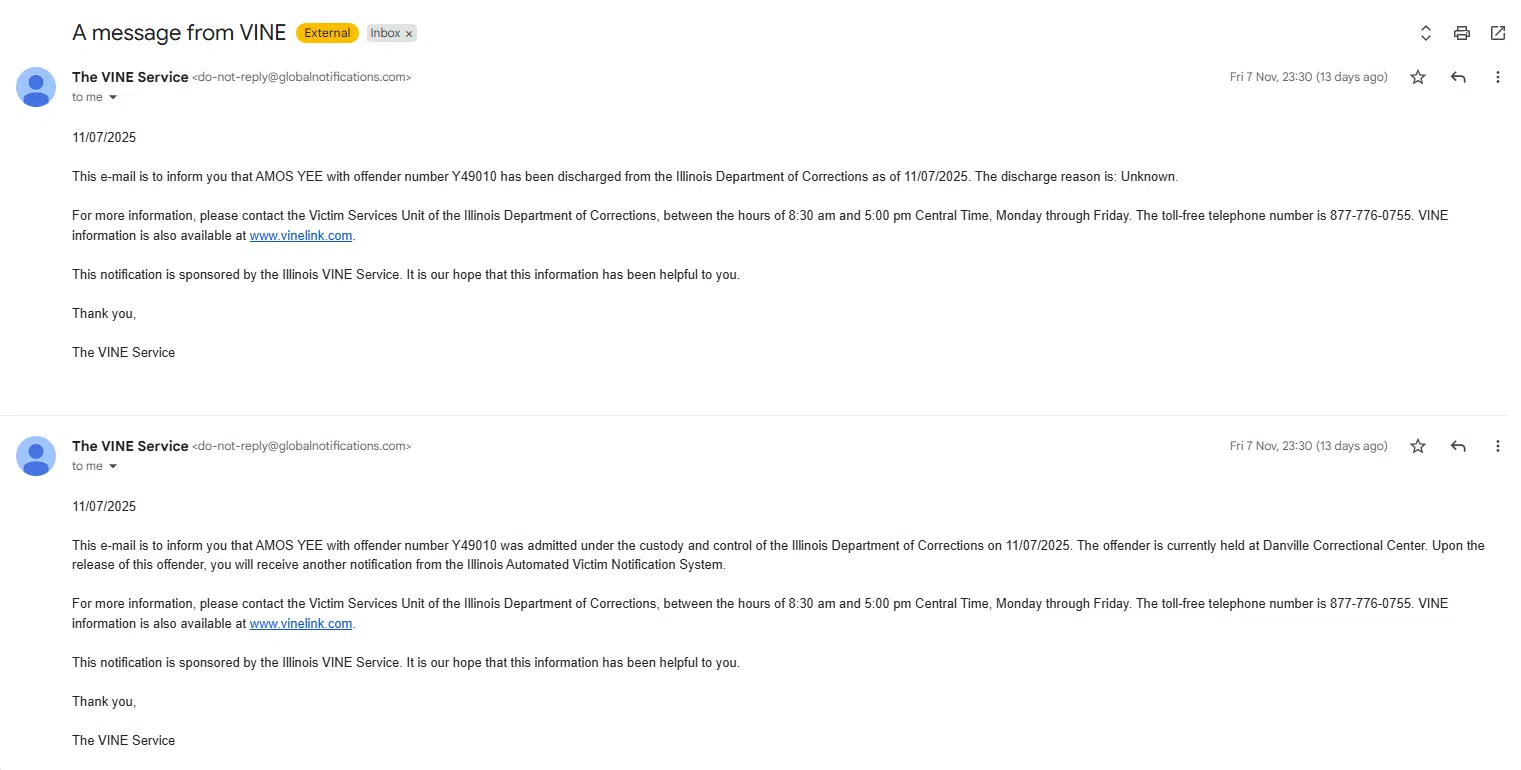 A notification from the Victim Information and Notification Everyday, or VINE, service at 7.14am Illinois time (9.14pm Singapore time) said Yee was let out of prison.