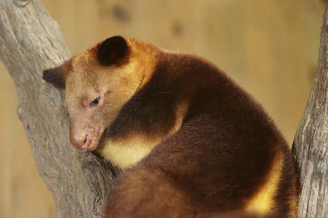 Susu, an 18-month-old Goodfellow’s tree kangaroo, loves perching on the highest branch in his exhibit.