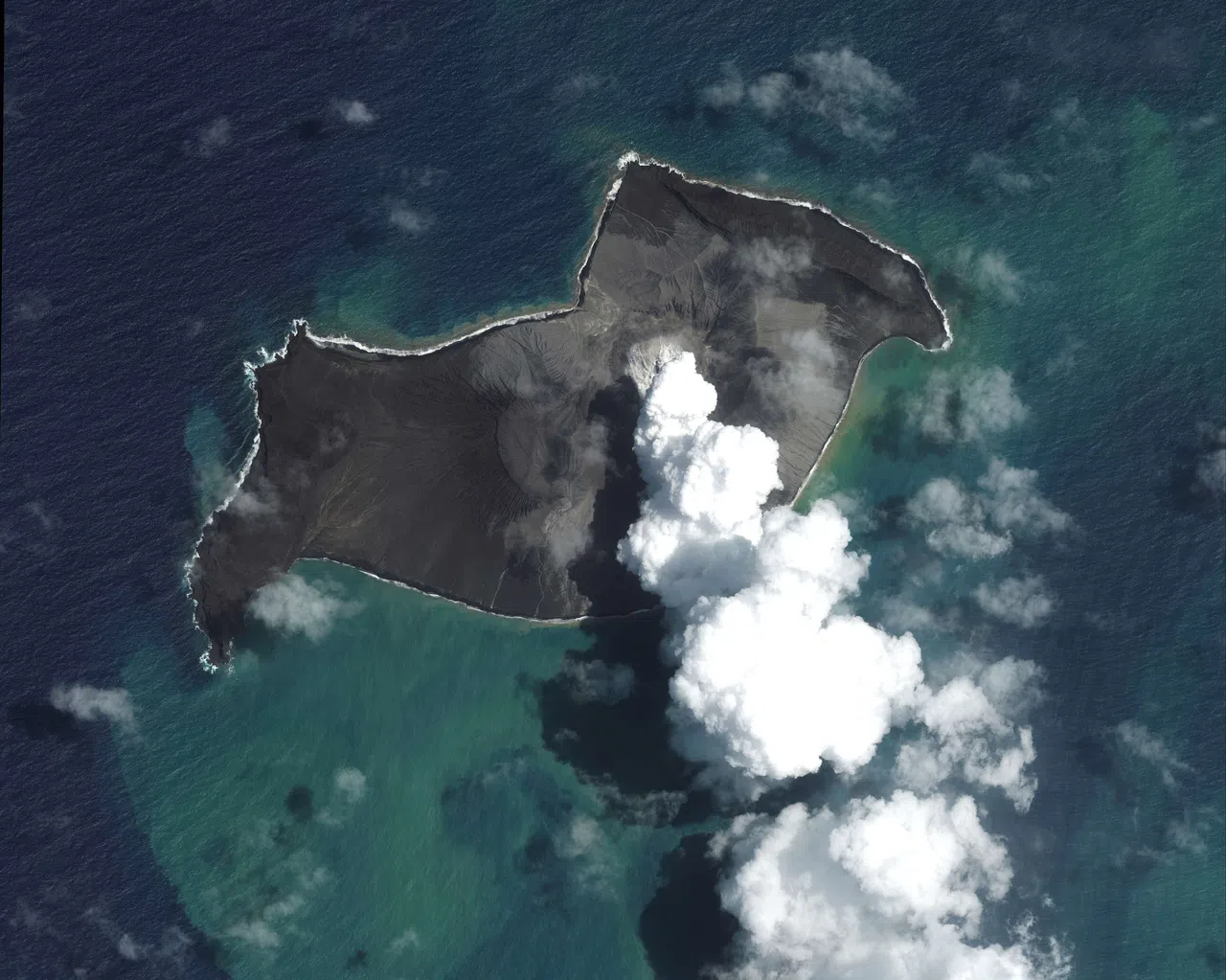 This satellite image shows smoke and ash being released by the Hunga-Tonga - Hunga-Haa’pai volcano just over one week before a massive eruption destroyed most of the island on January 15.